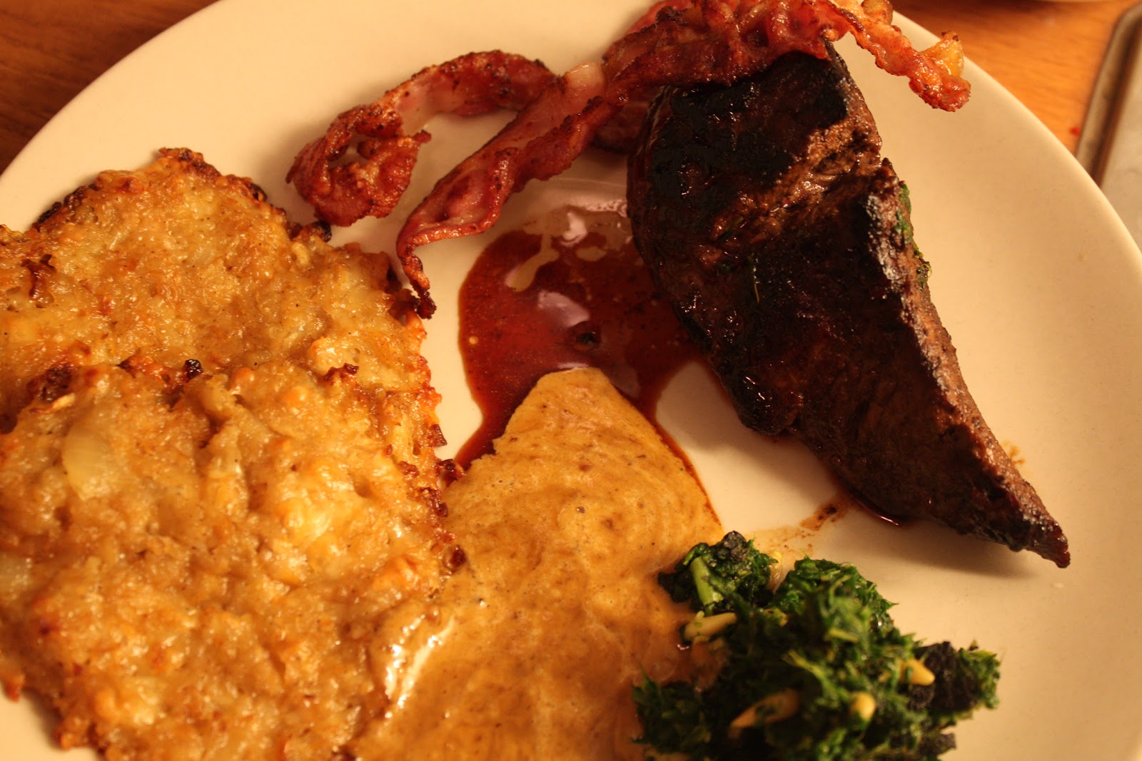 Jeg steker 4 skiver bacon og legger til side, og steker biffen i den samme pannen. Ved siden av har vi spinat: