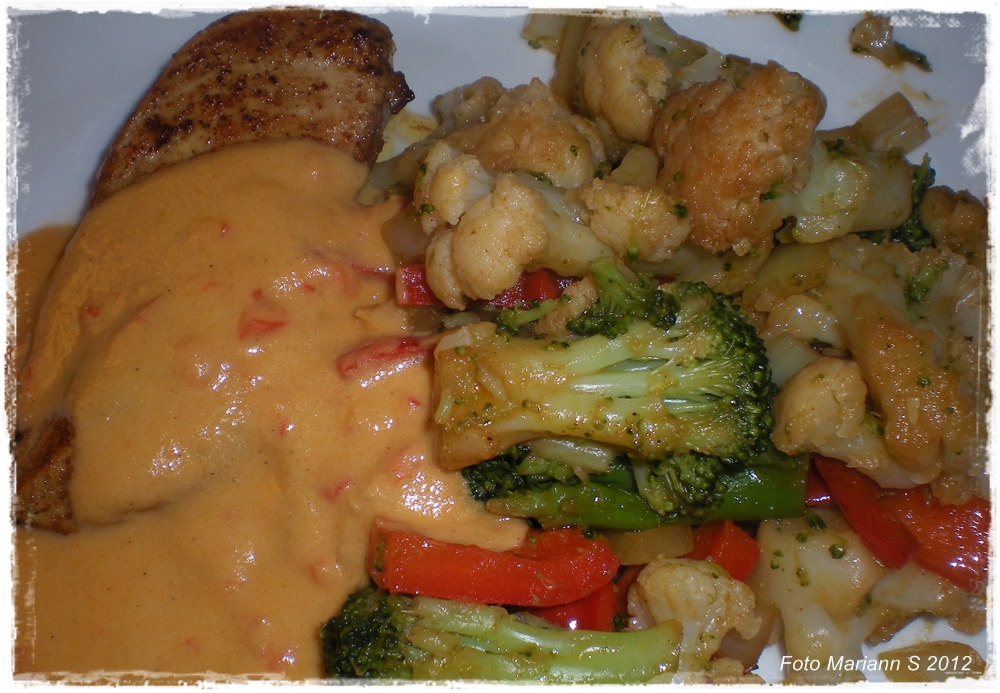 Knallgod saus til steikt kylling og steikte/woka grønsaker (blomkål/brokkoli fikk ett oppkok i vatn først).