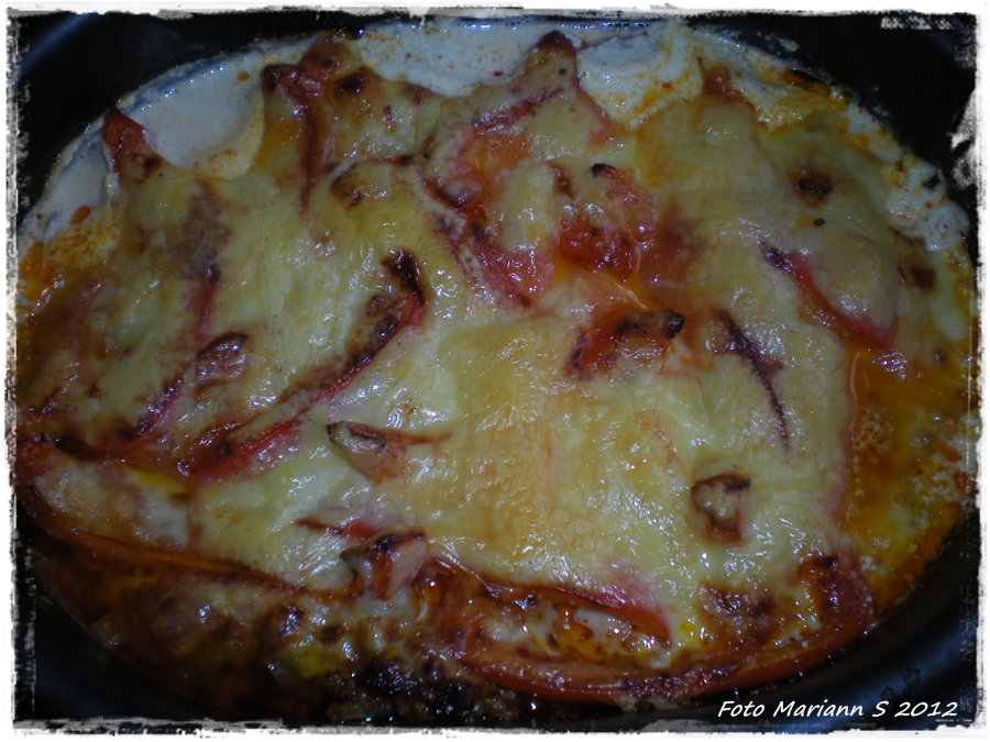 Ha creme fraiche i botnen på ei eldfast form. Hell kjøttdeigblandinga over.